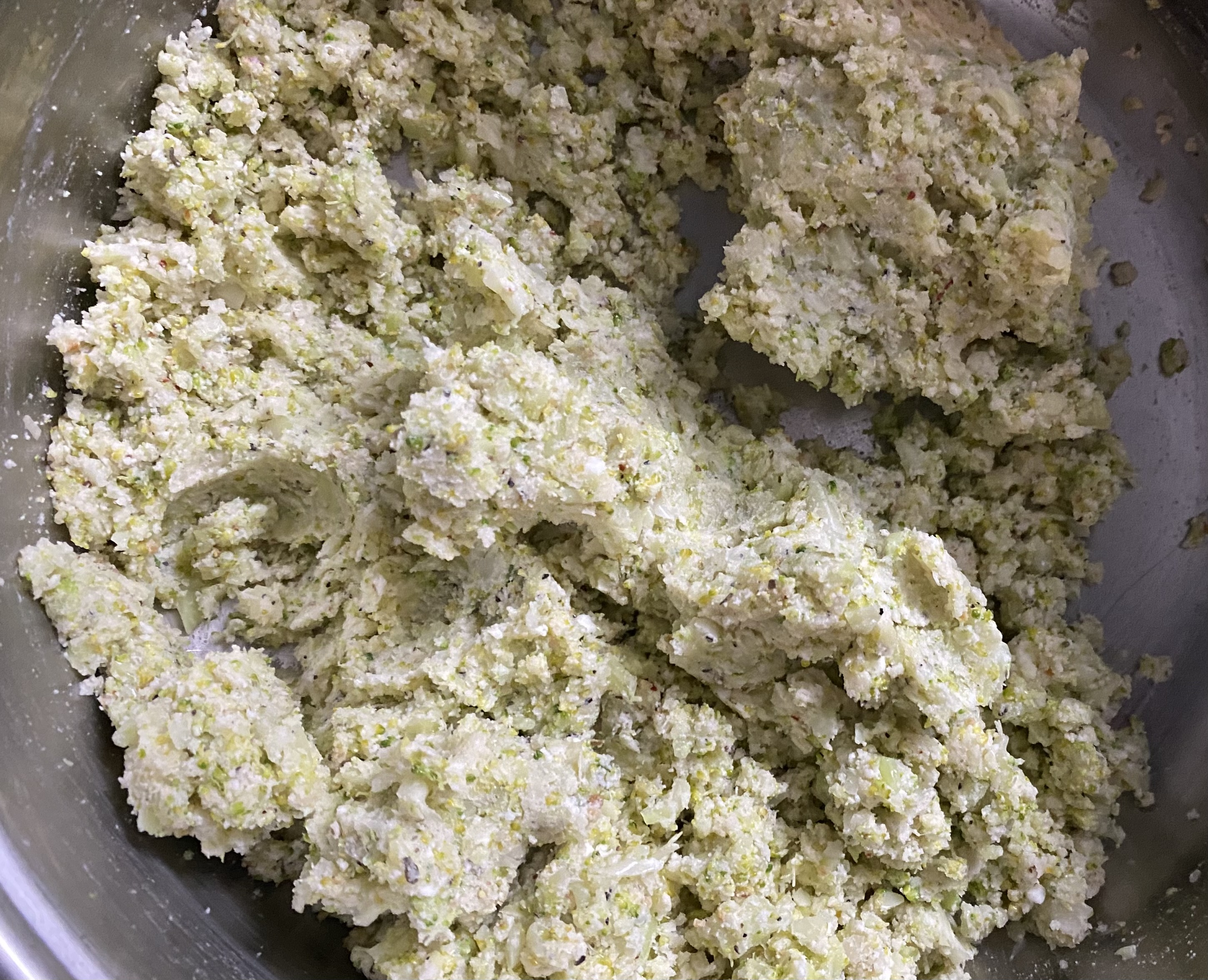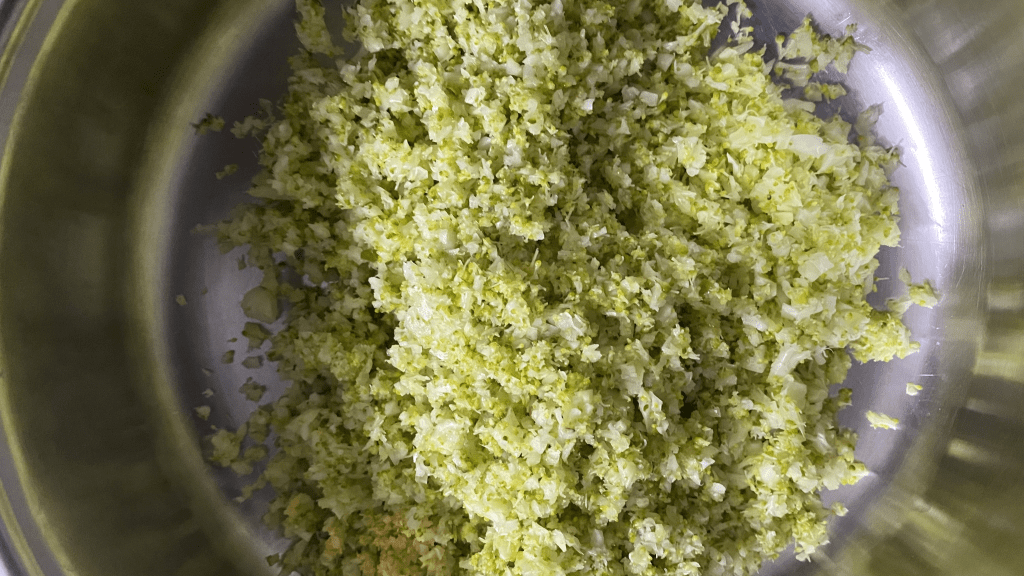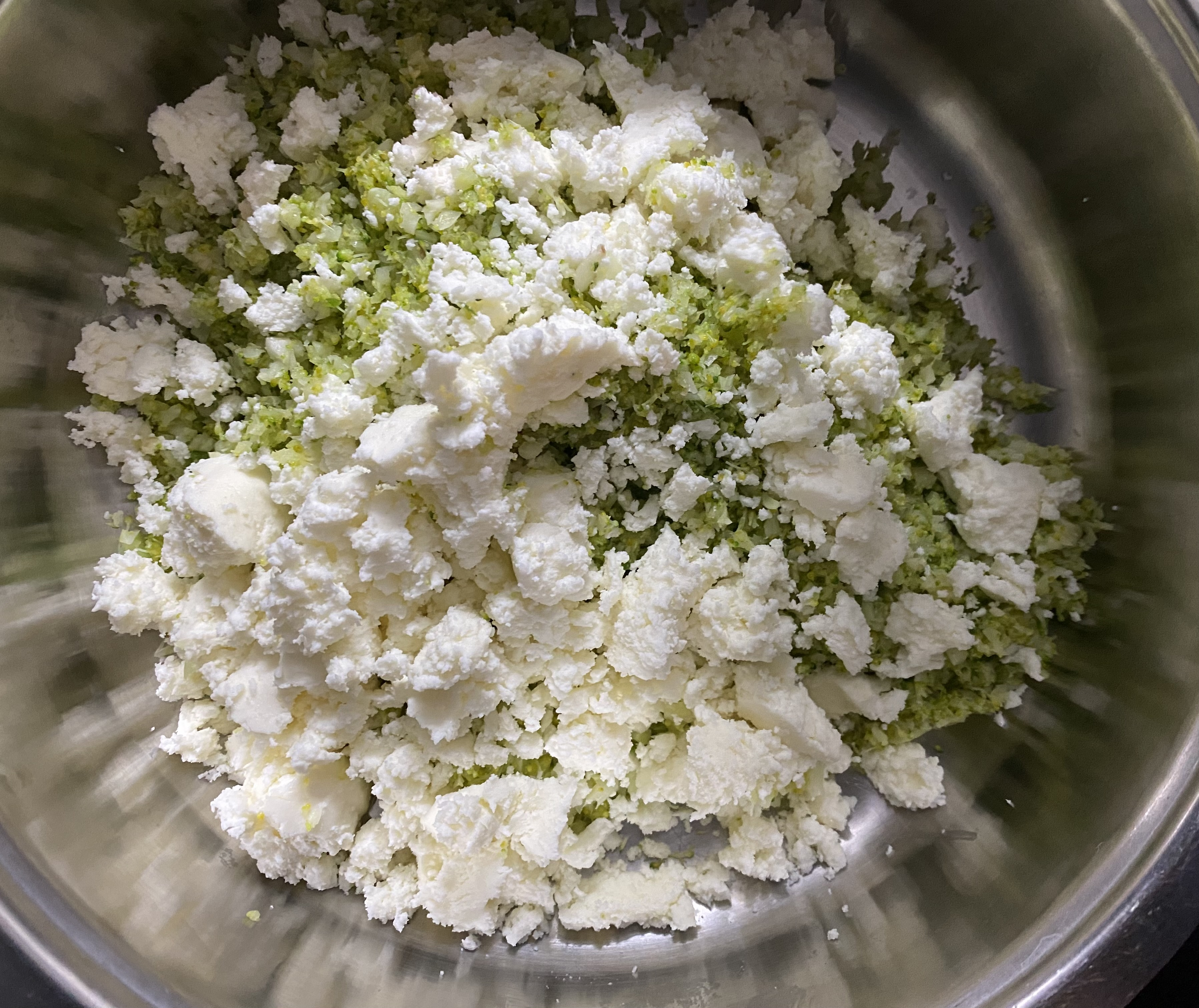 - In a large bowl, mix the blitzed broccoli mixture with grated paneer, pepper powder, oregano powder, and salt. Mash the mixture well to ensure the ingredients are thoroughly combined and the cottage cheese binds everything together smoothly. I avoided potatoes, but you can add boiled potatoes and mash them together with this mixture or add potato flakes to this for added taste and texture. (check images at the end of this post)