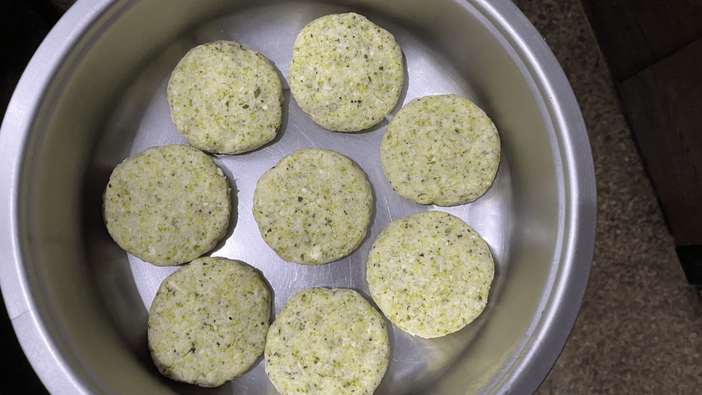 - Divide the mixture into equal portions and shape them into flat tikkis or cutlets.
